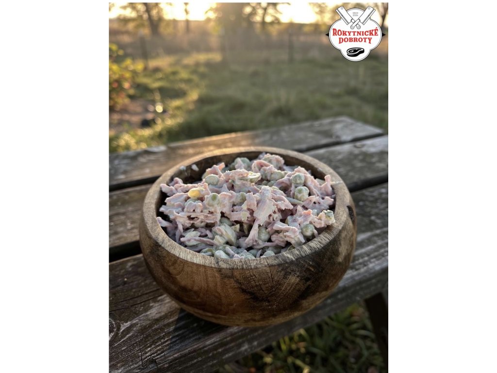 Složení: Junior salám, kyselé okurky, hrášek, majonéza, cibule, hořčice, ocet, cukr, vorčestr, jedlá sůl s jódem, pepř