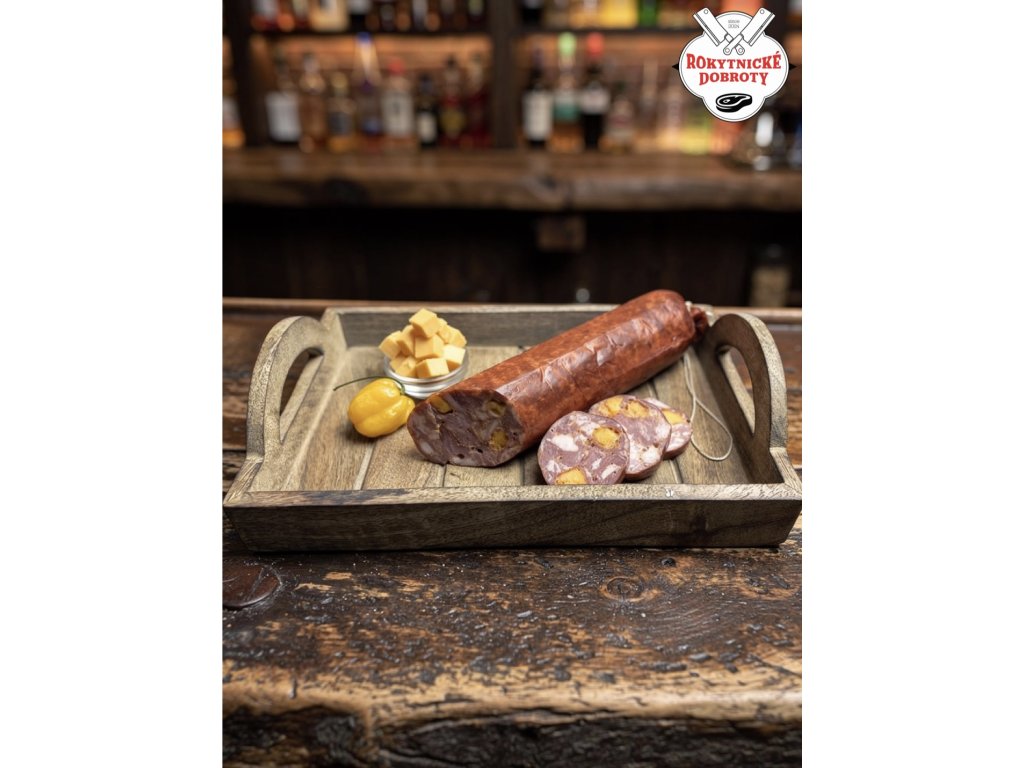 Složení: Vepřové a hovězí maso, směs koření, jalapeňos papričky, chedar, konzervant E250