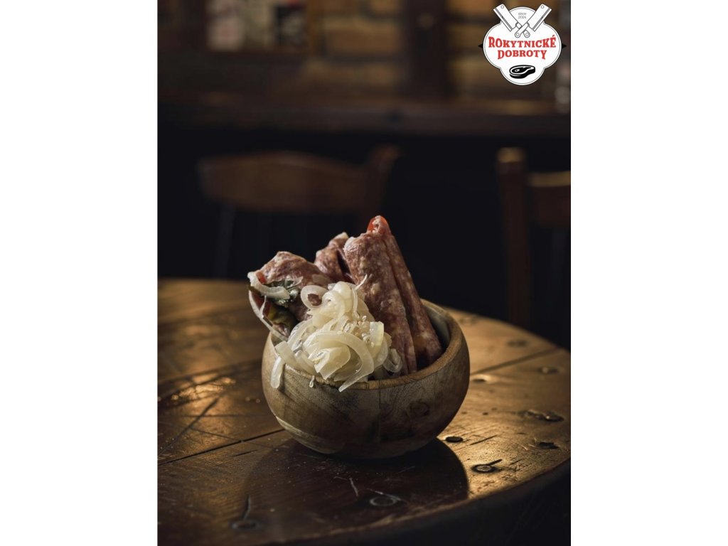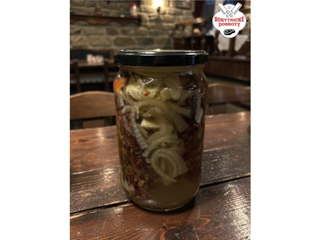 Složení: Vepřové a hovězí maso, směs koření, cibule, paprika, kyselé okurky, ocet, hořčice, voda, bobkový list, nové koření, pepř, jedlá sůl s jódem, konzervant E250